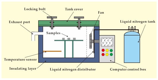 A program-controlled cryogenic system (CDW-196, Jinan, China) was used for the deep cryogenic treatment. The schematic diagram is shown in Figure 1. In this device, liquid nitrogen acting as the coolant flows into the distributor to be uniformly dispersed, and then evaporates into nitrogen. Under the action of fan rotation, the gas flow enters the cryogenic tank and exchanges heat with samples. Then, the relatively hot nitrogen gas is emitted into the atmosphere from the exhaust port. Parameters including temperature, cooling rate, and soaking time can be accurately controlled by the computer. In this experiment, the samples were cooled from room temperature (25 °C) down to −190 °C at the cooling rate of 5 °C/min, holding for 1, 2, and 3 h, respectively, and then warmed up to room temperature at a speed of 1 °C/min.