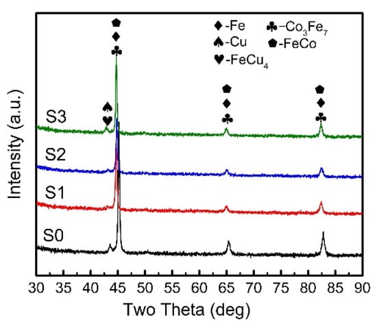 The XRD patterns of matrix samples with different deep cryogenic treatment times are shown in Figure 3. The elemental phase Fe, Cu, and intermetallic phases of Co3Fe7, FeCo, and FeCu4 were observed in all samples. Note that the deep cryogenic treatment did not lead to an obvious change in the lattice parameters of phases, as determined on the basis of the XRD analysis.