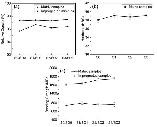 Mechanical properties of samples. (a) The relative density of all samples; (b) The HRC values of matrix samples; (c) The bending strength of all samples.