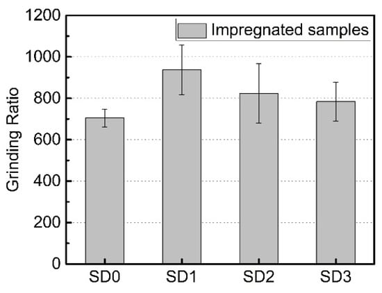 The grinding ratio is an important indicator to evaluate the wear resistance and tribological performance of diamond-impregnated composites [28,29]. The bar chart in Figure 7 summarizes the results for the grinding ratio of impregnated diamond samples with different deep cryogenic treatment times. The grinding ratio increased remarkably after deep cryogenic treatment, proving that deep cryogenic treatment improved the wear resistance of the impregnated diamond composites. With increasing deep cryogenic treatment time, the grinding ratio first increased and then decreased. The grinding ratio of sample SD1 showed a 32.9% increase in comparison with SD0.