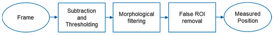 where Oi is the i-th region, θs and θf are the minimum and the maximum size of region, respectively; they are determined based on the true size of the target. The center of each target region is considered a measured position for target tracking in the next section. Figure 2 is the block diagram of moving object detection.