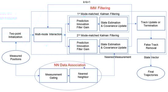 Tracking can be performed by means of a consecutive estimation of the target state, such as the position, velocity, and acceleration []. The Kalman filter is known to be optimal under independent Gaussian noise assumption in estimating the target’s dynamic state in real time []. The interacting multi model (IMM) can handle multiple targets with different maneuverings, because it can switch the target’s dynamics between multiple modes []. IMM was researched with an unscented Kalman filter (UKF) in []. The effect of the multi-modal approach on high maneuvering was emphasized in [].