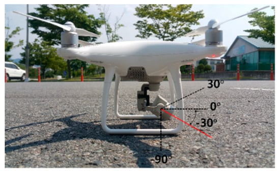 A drone (DJI Phantom 4 Advanced) was used to capture moving objects. The drone, with an attached gimbal and camera, is shown in Figure 4. The gimbal can tilt the camera within a 120° range (−90° to 30°). The camera pitch was set to −30° during the experiments.