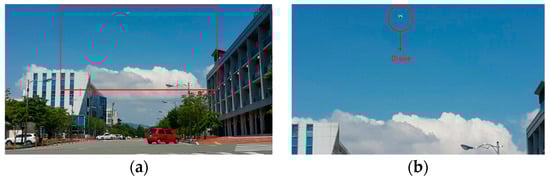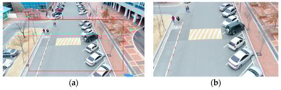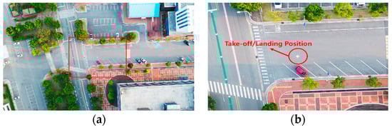 The drone ascended to a height of 15 m and stayed still as a stationary sensor (platform), as shown in Figure 5. It maintained its position while capturing video sequences of moving objects in the campus area. Figure 6 shows the take-off/landing position. Figure 6 was taken by a camera pointing directly downwards (−90° pitch) at a height of 100 m, to better visualize nearby buildings and structures. Figure 7a shows a sample frame extracted from the video. The size of one frame was 4096 × 2160 pixels; the frame was reduced to 20% size for efficient image processing, and the front and central part was cropped to 550 × 300 pixels, as shown in Figure 7b.