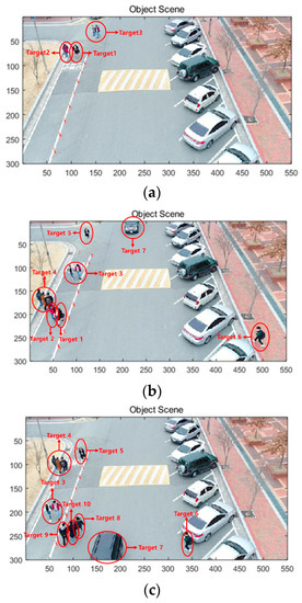 The drone captured a video sequence at 30 frames per second (fps) at a height of 15 m. A total of 13 people and 1 car were captured for 550 frames (16.5 s). Figure 8a shows Targets 1–3 at the sixth frame, Figure 8b shows Targets 1–7 at the 350th frame, and Figure 8c shows Targets 3–10 at the 550th frame. Table 1 shows the duration, moving direction, and components of each target. All targets were composed of one person or one car except for Target 3 and 4, which were composed of two and three people, respectively. Target 1 was partly composed of two people, because the person in Target 2 merged to Target 1 after 237th frame.