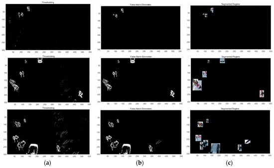 (a) Frame subtraction with thresholding, (b) morphological filtering and false region removal, (c) target region windows.