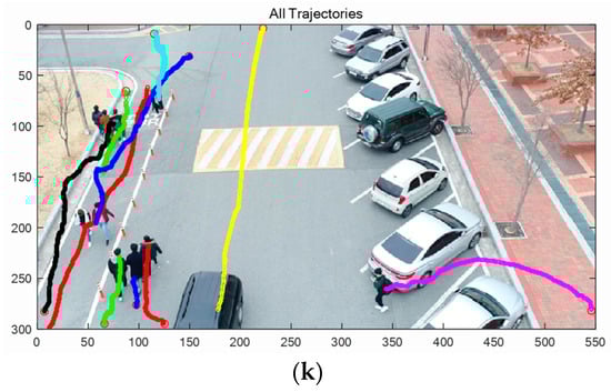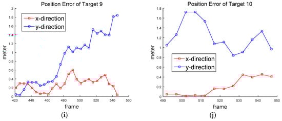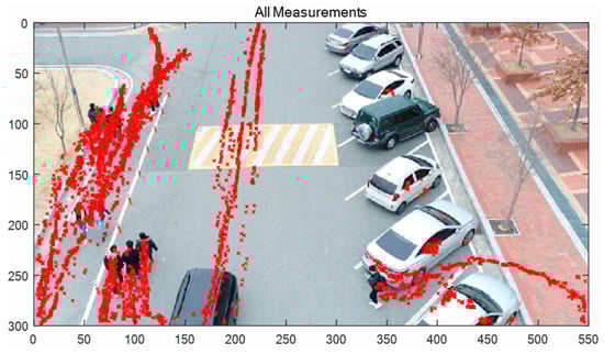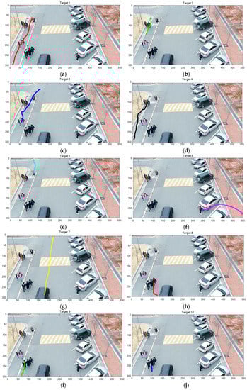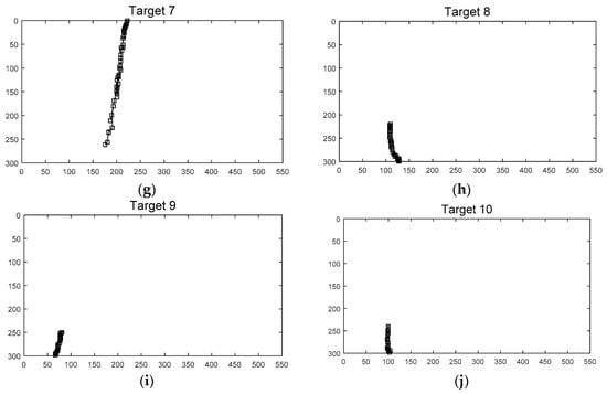 Figure 10 shows all the measured (detected) positions of 10 targets, including false alarms. The sampling time Δ in Equation (5) was 0.033 s, since the frame rate was 30 fps. It was assumed that one pixel corresponds to 0.1 m. The standard deviations of the process and the measurement noise of the two-mode IMM filter were set at , , and , respectively.