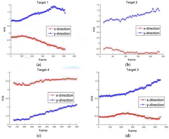 Figure 12 shows the ground truth of the position of the targets. Figure 13 shows the approximated ground truth of the velocity in x and y directions, obtained by Equation (33); was set at 65 when the least average velocity RMSE was produced. Figure 14 and Figure 15 show the position in Equation (30) and velocity errors in Equation (32), respectively.