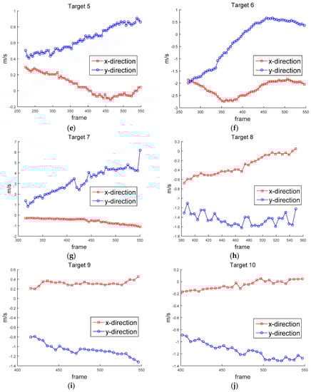 Ground truth of velocity in x and y directions, (a) Target 1, (b) Target 2, (c) Target 3, (d) Target 4, (e) Target 5, (f) Target 6, (g) Target 7, (h) Target 8, (i) Target 9, (j) Target 10.