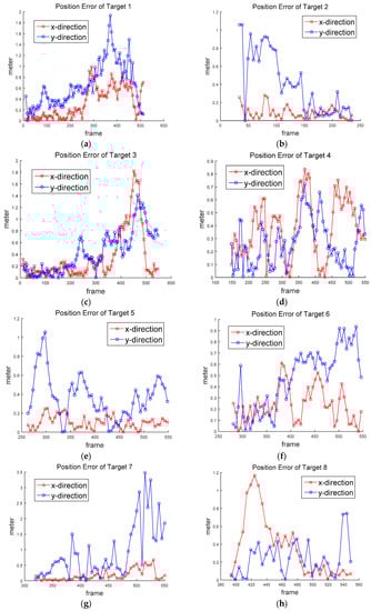 Several metrics are used for performance evaluation, position error, velocity error, and RMSE of position and velocity. The position error of target t at frame k is obtained in x and y directions, respectively: