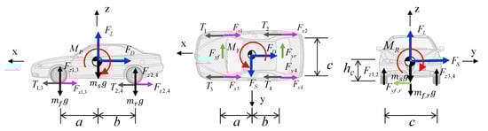 In order to establish a two-axle, quasi-static vehicle model, the basic concept proposed by Baker [3] and Batista and Perkovič [10] was adopted. Six equilibrium equations for x, y, and z axes were derived to consider the longitudinal, lateral, and vertical tire forces, as shown in Figure 1. After adding the weight of the wheel, we obtained six equilibrium equations as follows.