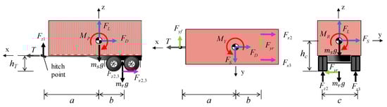 Tractor-trailers are exceedingly vulnerable to side winds. The trailer portion, in particular, is vulnerable to side winds due to its large surface area, and it only has one rear axle to resist overturning. Therefore, the present study simulated the quasi-static approach only for the trailer portion, as shown in Figure 2, with the assumption that the hitch point that connects trailer to tractor cannot resist the rolling, yawing, and pitching moments. Six equilibrium equations were developed for the same procedure in the case of two-axle vehicles, as shown in Equations (9)–(14).