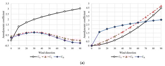 In Equations (15) and (16), , , , , , and are the aerodynamic coefficients for drag force, side force, lift force, rolling moment, pitching moment, and yawing moment, which can be determined from wind tunnel tests or by computational fluid dynamic analysis; is the air density (=1.225 kg/m3); is the apparent wind speed; and is the front area of the vehicle.