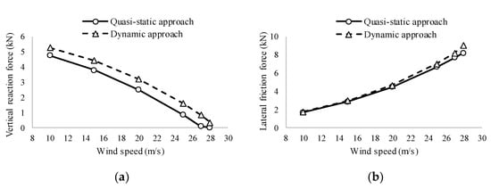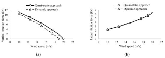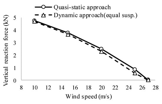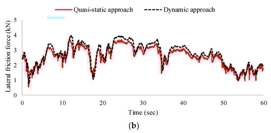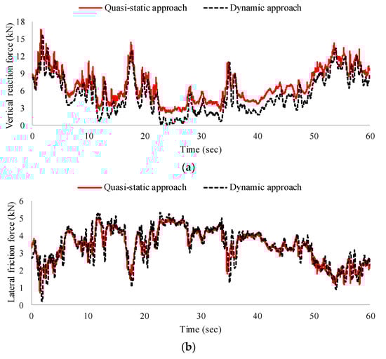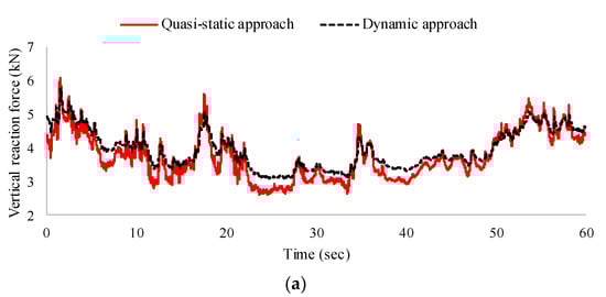 We identified larger differences in the vertical reaction forces than in the lateral friction forces, as shown in Figure 12a and Figure 13a. In the case of the van, the minimum vertical reaction forces from the quasi-static and dynamic approaches were 2.61 and 3.07 kN, respectively. However, when the same stiffness and the same position of the suspension springs was applied to all tires in the dynamic approach, the minimum vertical reaction force was reduced to 2.45 kN, which approximates that of the quasi-static approach. The cause of the difference was previously identified under a uniform wind velocity.