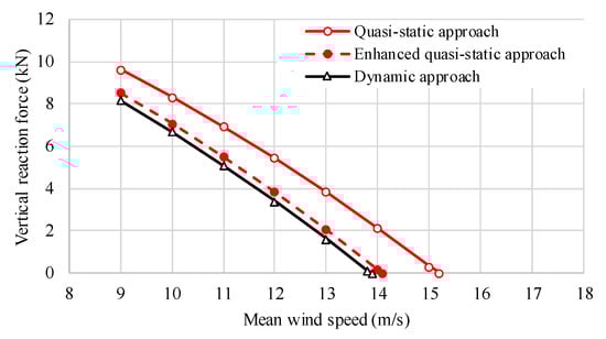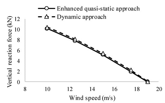 In order to estimate the critical wind speed for trailers regarding an overturning accident, the vertical reaction forces of the windward tire were obtained for various mean wind speeds. Figure 17 compares the vertical reaction forces estimated using the quasi-static, the enhanced quasi-static, and the dynamic approaches. The differences between the vertical reaction forces estimated using the quasi-static approach and those estimated using the dynamic approach were a result of the additional rolling moment. Consequently, the critical wind speeds differed by approximately 1.3 m/s between the two approaches, as shown in Table 2. On the other hand, the enhanced quasi-static approach, which considers the additional roll moment, provided reaction forces that approximated those of the dynamic approach with a critical wind speed difference of only 0.2 m/s.