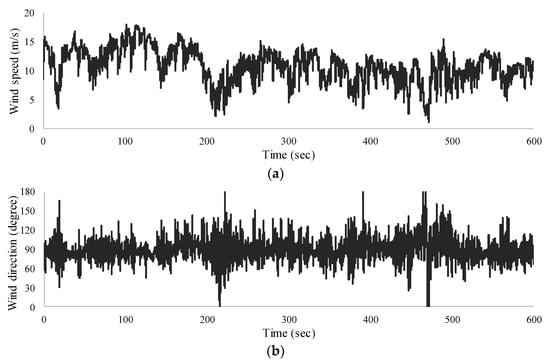 Time history of wind data: (a) wind speed and (b) wind direction.