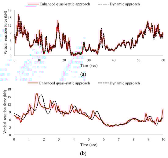 A difference of approximately 10% was identified between the two approaches with respect to the vertical reaction forces of the trailer, as shown in Figure 13a. As with uniform wind velocity, the enhanced quasi-static approach was also applied to the trailer. Figure 14a shows the time history of the vertical reaction forces acting on a windward tire obtained from the enhanced quasi-static approach, and Figure 14b lists the results for the first 10 s. As shown in Figure 14a, the enhanced quasi-static approach provided a vertical reaction force that approximated that of the dynamic approach. This illustrates how the difference in Figure 13a originated from the additional moment induced by the lateral displacement of the sprung mass, as was demonstrated in the uniform wind velocity case. As Figure 14b demonstrates, however, the phase and frequency for the two approaches changed within a smaller time duration due to the effect of the suspension model in the dynamic approach. However, this effect was not critical in estimating the magnitude of the vertical reaction forces of the tire. Accordingly, the feasibility of the enhanced quasi-static approach for the safety assessment of trailers was successfully demonstrated even under turbulent wind conditions.