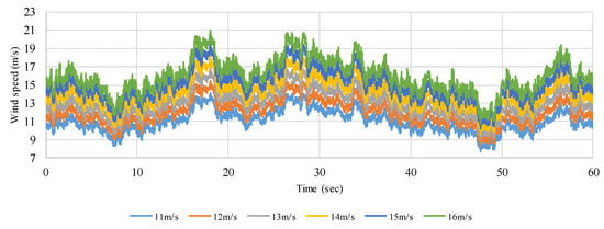 Generated wind speed data for the mean wind speeds of 11 m/s–16 m/s.