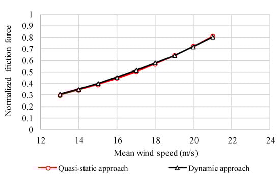 Figure 16 shows the normalized friction force of the van for the turbulent wind at different mean wind speeds. The normalized friction force was determined as the maximum value from among the 1 min applications of turbulent winds. The normalized friction force obtained from the quasi-static approach showed good agreement with that from the dynamic approach for all wind speeds. The critical wind speed was determined using Equation (29) for the occurrence of a side-slip accident for the van, which was determined to be approximately 21.0 m/s using both approaches.