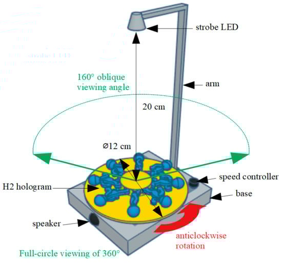 - Gentet, P.; Joung, J.; Gentet, Y.; Hamacher, A.; Lee, S.H. Fantatrope, a moving hologram display: Design and implementation. Opt. Express 2019, 27, 11571–11584. [Google Scholar] [CrossRef] [PubMed]