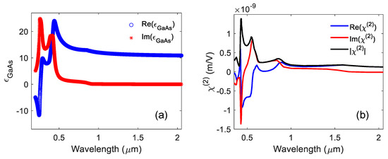 where is the pump angular frequency, indicate the pump electric-field components, and indicate the SH induced current components. Both the relative permittivity of GaAs, , and the nonlinear susceptibility are weakly dispersive at infrared wavelengths, in particular for photon energies smaller than the GaAs energy bandgap, , where . The frequency-dependence becomes significant at shorter wavelengths (), where interband transitions play a non-trivial role in the spectra of SH light scattering and absorption. In Figure 1, we plot the real and imaginary parts of and that we use for calculations of linear and nonlinear scattering and absorption efficiencies. Linear and nonlinear optical data are taken from [23,24,25,26], respectively. Both models account for the electronic band structure of GaAs, and therefore they include the , , , and transitions of GaAs.