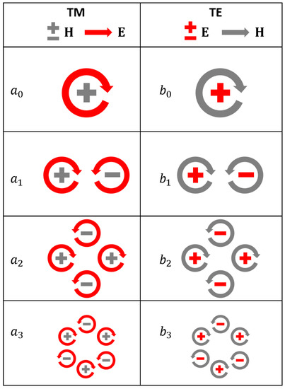 TE light scattering only depends on the inside the nanowire) coefficients, while TM scattering is only ruled by the inside the nanowire) coefficients. Although the expansions in Equations (2)–(5) are valid for plane waves, it is possible to expand the fields with the same Mie coefficients in the presence of any kind of source, including SH sources induced in the volume and on the surface of the nanowire. In other words, TE(TM) scattered fields are always equal to the superposition of normal modes of an increasing order number, each weighted by the corresponding coefficient ). The normal modes of an open cavity must radiate into the far-field [28], and therefore it is common to associate them with cartesian multipoles [29,30]. For example, the Mie coefficient is related to a magnetic-dipole moment (or electric quadrupole [29,31]) and the associated electric field is of type ; the coefficient is associated with a superposition of an electric dipole moment and a combination of electric-octupole moments. Higher-order coefficients , with are related to higher-order multipoles. TE-polarized normal modes are instead weighted by the coefficient and they are z-polarized. The coefficient is related to a TE mode with electric field distribution associated with an electric dipole, therefore of type . Similarly, in the TM case, coefficients with are associated with higher-order modes. In Figure 2, we summarize the electric and magnetic field distributions associated with the first four TE- and TM-polarized modes with the corresponding Mie coefficients.