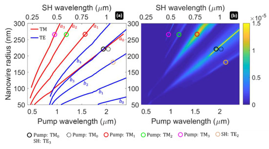 (a) Maximum peaks of the Mie scattering coefficients monitored as a function of nanowire radius. For TM-scattering coefficients (), the wavelength axis is on the bottom (pump wavelength); for TE-scattering coefficients (), the wavelength axis in on the top (SH wavelength). (b) Color map representation of SH scattering efficiency as a function of wavelength and nanowire size. The circles in (a,b) highlight scenarios in which either the pump or the SH, or both pump and SH, are coupled to normal modes of the nanowire.