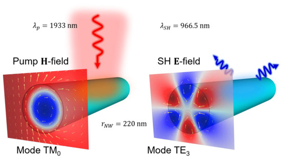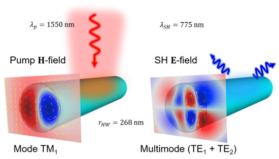 In Equation (19), is the field distribution in the nanowire under TM plane wave excitation at the pump frequency with amplitude and incident at , is the field distribution at the pump frequency under TM plane wave excitation with amplitude and incident at , and is the field under TE plane wave excitation at the SH frequency with amplitude and incident
