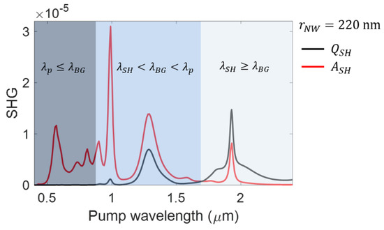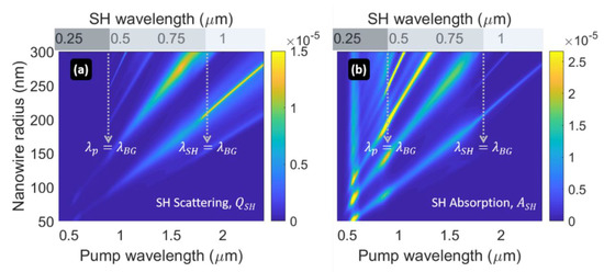 can be significant in enhanced nonlinear interactions at the nanoscale. For example, in plasmonic resonators, in addition to the pump energy lost as heat in the metal, reabsorption of SH light is orders of magnitude larger than far-field scattered SH light [32,33,34]. In other words, in many nanoplasmonic systems designed to resonate at the pump and/or at the harmonic frequency. Dielectric resonators are considered immune to pump absorption if illuminated in the transparency region below the bandgap (i.e., if the pump wavelength is larger than ), although Mie theory predicts that light absorption on the Mie resonances above the bandgap can reach values as high as 5% of the total light extinction for GaAs nanowires, as one can infer by comparing absorption maps and scattering maps in Figure 3. In addition, a study of SH light absorption in dielectric nanoantennas (isolated or in metasurfaces) has not been reported so far, taking for granted that most of the SH light is scattered in the far-field by dielectric resonators, and not absorbed in the near field. Here we demonstrate that this is not the case, at least for nanowires with 2D light-confinement. In Figure 7, we report a side-by-side comparison of SH scattering efficiency spectra, , and SH absorption spectra, , as functions of the nanowire radii.