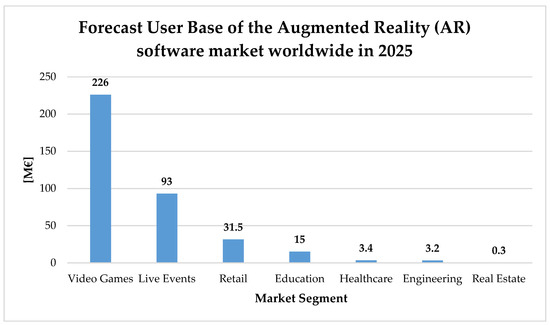 Despite the wide range of AR applications in several market segments and the consequential forecast of market expansion (Figure 1), recent research on the use of AR technology in industrial environments has shown that major problems such as hardware and software development, weight, ergonomics, limited user acceptance, visual fatigue and concentration, data transfer, integration, security, content creation, adaptive instructions, marker tracking reliability, and cost [4] still exist. There is no specific hardware and software solution that solves all the applications demands in the industry, and the definition of symbols needs to be done contextually and depending on the type of operation/activity to be performed.
