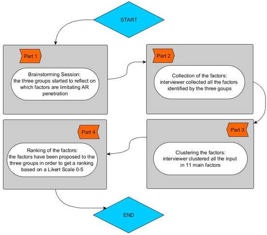 To avoid possible bias during the evaluation process caused by the interviewer pre-assumptions, firstly the participants were asked to brainstorm about all the difficulties, downside, and pitfalls of the applications and of the process. Figure 3 shows the methodological steps used during the survey for identifying the main factors that are reducing AR penetration on the market.