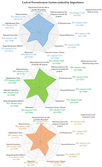 The results acquired with the three surveys, based on the Likert Scale evaluation show comparable concerns and AR limitation motivations regardless of the industrial sector. The values are expressed in percentage points. Together with the mean value and the standard deviation (sd), they represent the possible contribution (according to the interviewees’ considerations) of a specific factor to the overall lack of AR pervasiveness.