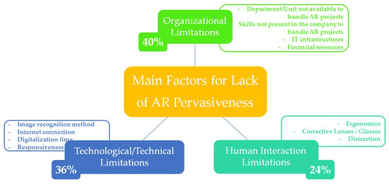 To improve the understandability of the survey, its results, and to indicate possible measures to take, the 11 factors, already originated by a first round of grouping, have been further clustered to three final factors, and considered as overall limitations to the AR pervasiveness. As shown in Figure 5, these were the organizational limitations (accounted for 40%), the human interaction limitations (accounted for 24%), and the technological/technical limitations (accounted for 36%). With different weight, each part contributes to reduce the possible deployment of AR technologies in the industrial sectors. AR and IT in general still remain “technology push” in the relatively conventional operations and maintenance domains.