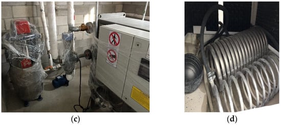 Components of the thermosolar absorption cooling system at Puertecitos school, where we can appreciate the (a) thermal energy storage tank, (b) cooling tower with freshwater and seawater storage tanks, (c) auxiliary heater and chiller inside the machine room, and (d) titanium coil inside the cooling tower.