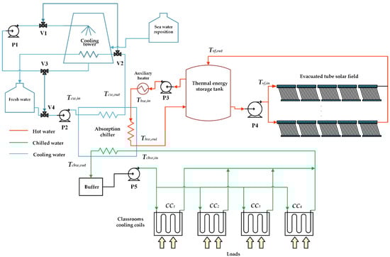 The schematic diagram of the components and connections is shown in Figure 3. The solar collector field is responsible for maintaining the temperature of the TEST in the range of 75–96 °C, enough for proper chiller operation. Regardless of whether the cooling machine is operating or not (for example, on weekends, the chiller does not operate because there are no classes), the solar field pump continues to provide fluid for heating until the tank is completely at the set point temperature, in this case 96 °C, always seeking to have the system in operating conditions. When there is a need for classroom air conditioning, the chiller turns on and the TEST pump supplies hot water from the top. Since the temperature of the generator of the absorption machine is at an optimal level for operation, the pump of the chilled water circuit is turned on to bring it to the cooling coils of the classrooms, at a temperature between 7 and 10 °C, removing the heat from the spaces to be air-conditioned. This current is taken to the chiller to be cooled again. It is worth mentioning that the configuration of the chilled water circuit allows controlling the number of cooling coils used for air conditioning, allowing a saving of thermal energy when air conditioning is not required in all classrooms.