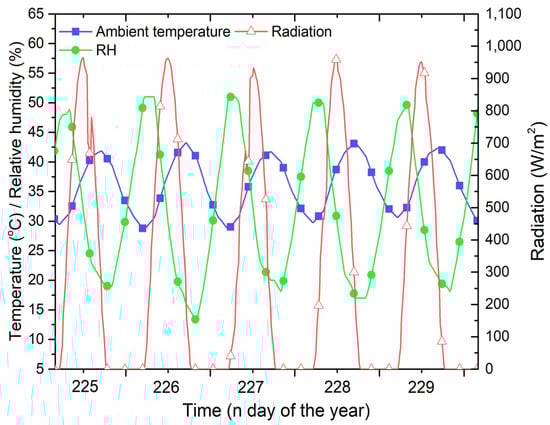 The cooling system operates under an established school schedule of 8:00 a.m. to 3:00 p.m. Monday through Friday, which are typical class hours in Mexico. The vacation periods correspond to the months of July and part of August, the same days in which the highest ambient temperatures are present; thus, a constant operation is expected during May, June, mid-August, and September, where the penultimate month is the critical one due to the extreme temperatures present. Figure 4 shows the ambient temperature, relative humidity, and global radiation conditions based on a TMY file of the study region for the simulation period, corresponding to warm and sunny days in August. Being a coastal community, the relative humidity plays a very important role in the proper operation of the cooling water circuit and, therefore, the system in general.