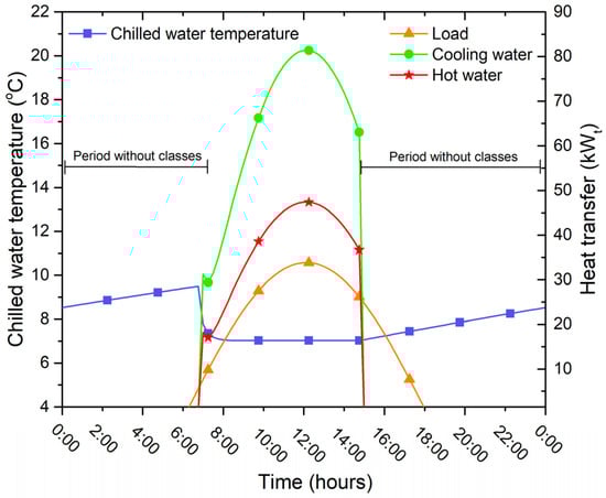Figure 5 shows the variation of the thermal load present in the classrooms during a typical operating day and the temperature of the chilled water coming from the absorption chiller. The thermal load starts at 6:00 a.m.; however, the chiller starts cooling the water at 7:00 a.m. As the hours pass, the load increases until it reaches 35 kW, with the maximum demand established at 12:00 p.m. corresponding to 8.75 kW per cooling coil. At 6:00 p.m., the thermal load is zero, but the cooling system is stopped 3 h beforehand as classes are finished and the facilities are empty, avoiding the consumption of thermal and electrical energy. The chilled water temperature remains constant at 7 °C during chiller operation due to the control of the heat supplied to the system by means of the hot water circuit. If the cooling load increases, the heat is taken out of the TEST to raise the capacity of the chiller and keep the operating conditions as stable as possible. Otherwise, if the load increases but the heat supplied to the system remains constant, it results in an increase in the temperature of the chilled water and, therefore, of the classrooms. In addition, the heat transfer rate to the chiller cooling water must be sufficient to maintain stable operating conditions, so that, as the cooling capacity increases, more heat is removed from the system by the cooling water circuit. It should be noted that the temperatures of the hot water and cooling water circuit do not remain constant, as they depend directly on the environmental conditions present during the operation of the system; however, they are always within the minimum ranges, as shown in Figure 6.