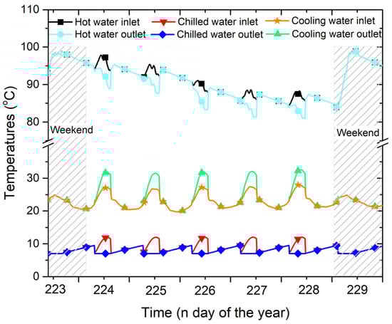 A typical week of operation is shown in Figure 6, where the temperature variations of the different circuits of the cooling system at its inlet and outlet can be appreciated. At the beginning of the week, the temperature of the TEST is in optimal conditions to start the system, around 97 °C for all its levels, as the field of solar collectors is dedicated to its increase in temperature on Saturday and Sunday. During the days of classes, the TEST tends to decrease its temperature significantly because the collection and storage of daily solar energy is not enough to return it to initial conditions. Since the operation of the chiller stops at 3:00 p.m., while there is still a solar resource, the TEST recovers a bit of its temperature level by keeping the solar collector pump on; however, this is not enough to counteract the loss of heat during the day. With the passing of operating days, the decrease in temperature becomes greater; thus, when the last day of classes arrives, the system operates in limited conditions of activation temperature (around 75–80 °C), while being able to satisfy the cooling demand of the classrooms. However, it is necessary for weekends to be exclusively dedicated to heating the TEST and bringing it to its initial conditions so that, at the beginning of the following week, the complete system is in optimal operating conditions and meets the cooling requirements during the five days of classes.
