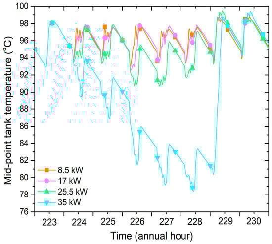 Figure 7 shows the behavior of the mean temperature of the TEST with respect to the variation of the maximum thermal load of the classrooms, using the profile presented in Figure 5 at 25, 50, 75, and 100% of the chiller capacity. Working the system with a maximum load of 35 kW ensures operation during the five days of classes as long as weekends are used to heat the TEST, as mentioned in the previous section. However, with a maximum load of 25.5 kW, corresponding to 75% of the capacity of the cooling system, it is possible to maintain constant operation for more than five days without having to spend the entire weekend heating it. The decrease in the average temperature of the TEST is recovered in the period with the availability of the solar resources after typical operation of 7:00 a.m. to 3:00 p.m. On the other hand, when operating at 50% of the maximum capacity or less, the temperature conditions of the system are kept stable, being able to operate normally for the whole week in the aforementioned period.