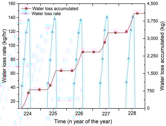 Rate of water loss due to evaporation in the cooling tower and its weekly accumulation.