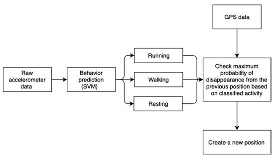 The proposed algorithm of the algorithm for reducing GPS error. Research data analysis is accompanied by receiving raw data stage to classify the activities of the goat. Animal behavior is classified using the real-time SVM prediction model. Finally, the method decides to create a new correct position.