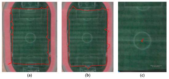 This research was performed in a 2.6-ha meadow on a rural landscape in the central region of South Korea located at 36°56′56.8″ N 127°54′40.8″ E. The experiment ground was sufficiently large and positioned away from urban canyons, as shown in Figure 4a. This position provided the best chance to observe significant experimental results. The nearest potentially interfering buildings were 620 m distance. The research was conducted in sunny weather with a mean annual temperature of 14 °C, and recorded extremes of 9 °C and 24 °C. We chose a playground as an experiment zone, as the area’s visible borders helped define the actual path, as shown in Figure 4b. The total length of the line is 345 m, the width is 68 m, and the height is 104 m. In all field experiments, we visually observed individual goat behavior using the smart collar, (as illustrated in Figure 1a), and occasionally, series of experiments were provided on any given day. In the current research, we provided experiments in seven days.