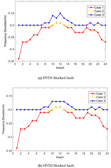 In case 0, HVDC operation cost is much lower than conventional units so that all two HVDCs are operated in rated capacity (1000 MW). In case 1, in order to ensure frequency deviation less than 0.2 Hz after one HVDC blocked, generating units start up while the HVDCs’ average power decreased to 989.2 MW. Although the total cost of case 1 is larger than case 1, the safety of the power system is already improved. In case 2, due to security constraints after the secondary frequency finished, two HVDCs’ average power continue to reduce to 967 MW and 974.9 MW, respectively. The safety of the power system would be further enhanced and the operational cost increase to $1,279,549, which is the highest of the three cases. From the perspective of computational efficiency, case 2 has the most calculation iterations, with 12 times and about 48 s.