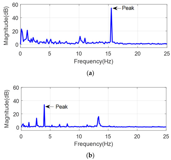 Fast Fourier transform (FFT) is applied for the frequency analysis of the periodic disturbances. Figure 5a is the result of applying the FFT to the flowrate output of Figure 4a, and Figure 5b is the result of its application to the output of Figure 4b. The peak frequency due to periodic disturbance is 15.556 Hz for the constant flowrate command of 400 cc/min, and 3.972 Hz for 100 cc/min. Since the flowrate command is a fixed value, the peak frequency of the flowrate output is considered as the frequency of the periodic disturbance.