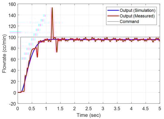 To verify the similarity between the actual plant model and the nominal plant model in Equation (2), the step response for the flowrate command of 100 cc/min is analyzed, as shown in Figure 7. MATLAB (2018b, Mathworks) was used for the simulation of the nominal plant model. After 2 s in Figure 7, the mean square error (MSE) between the simulation and experimental results is 2.134 cc/min, and the correlation between the results from 0 to 4 s is = 0.9384. For the flowrate commands of 100, 200, 300, 400, and 500 cc/min, the simulation results using the nominal plant model are compared with the experimental results in Table 1, and listed in Table 2. For the five flowrate commands, all of the MSEs were less than 2.5, and all were above 0.9. In Table 2, the MSE was relatively large in the low-frequency range of 100 and 200 cc/min due to the influence of the gear shape and frictions. In conclusion, the nominal plant model of Equation (2) is a transfer function expressing the actual plant model and that can be used for designing repetitive controllers.