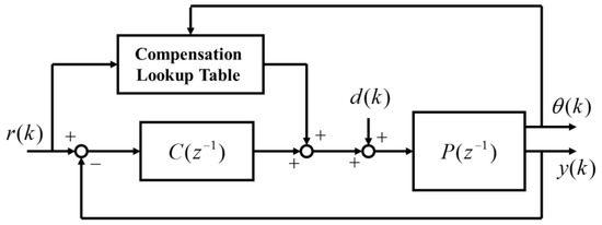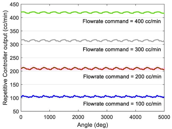 When the repetitive controller of Equation (3) is applied to the plant of Equation (2), Figure 8 shows the repetitive controller output (u(k)) at the steady state for flowrate commands of 100, 200, 300, and 400 cc/min. Figure 8 shows two characteristics of the controller output: (1) The controller output changes according to the motor’s flowrate command, and (2) the controller output is synchronized according to the rotational angle of the motor. This means that periodic disturbance occurs depending on the angle and rotational speed of the motor. It is difficult to remove the disturbance only by the repetitive controller if the disturbance of various periods occurs for a wide range of flowrate commands. Therefore, this study proposes a compensation lookup table that removes disturbance according to the rotation angle and rotation speed of the motor.