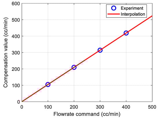 where index i is the kind of constant flowrate i.e., (). For example, in Figure 8, M = 4, . Thus, Equation (5) gives the average of the controller outputs for N samples at each flowrate command. The sampling period of this study was 1 ms, and N = 10,000 was set to average the controller output for 10 s in the steady state. From Equation (5), the compensation values for the flowrate commands of 100, 200, 300, 400, and 500 cc/min were experimentally obtained, and the linear equation obtained by linear interpolation is expressed as follows: