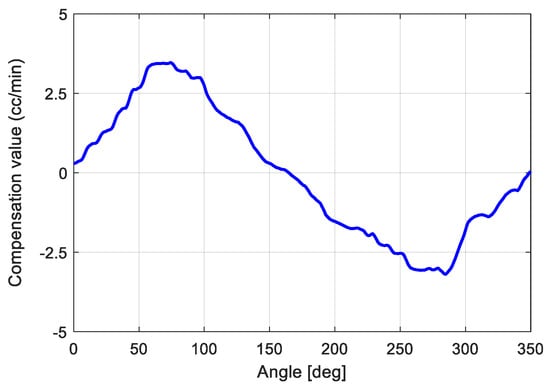 The flowrate command dependent compensation value and the angle-dependent compensation value obtained experimentally in Figure 9 and Figure 10, respectively, can be expressed as a lookup table, as shown in Figure 11. The input data of the compensation lookup table is the flowrate command and the current rotation position. Compensation lookup tables can obtain optimal compensation values that can remove periodic disturbances from input data.