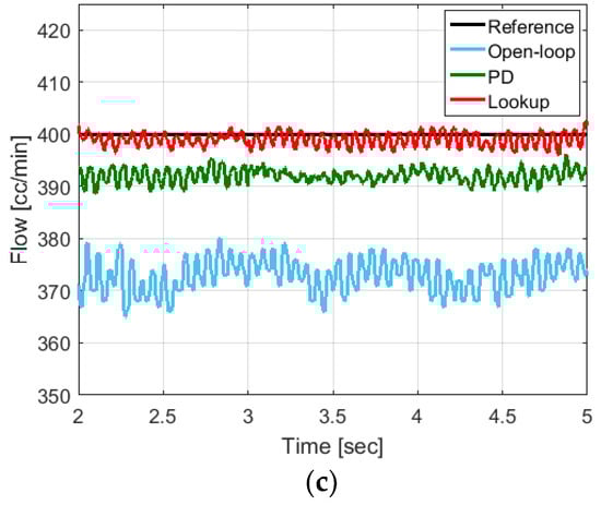 The proposed method in Figure 12 is experimentally evaluated. For the efficient tracking control, the PD controller is used as the feedback controller in Figure 12. Since the integral action can amplify the sensor noise and degrade the stability of the closed-loop, the proportional integral derivative (PID) controller is not used. The feedback controller follows the flowrate command () of 100, 150, and 400 cc/min, respectively. The experimental results of the measured flowrate output in the steady state are shown in Figure 13 and Table 3. The Figure 13a–c shows the experimentally measured flowrate outputs of 100, 150, and 400 cc/min, respectively. As shown in Figure 13, the blue line is the measured output of the open-loop system (Open-loop), the green line is the closed-loop system only using the PD controller (PD), and the red line is the closed-loop system using the compensation lookup table-based feedforward controller and the PD controller (Lookup).