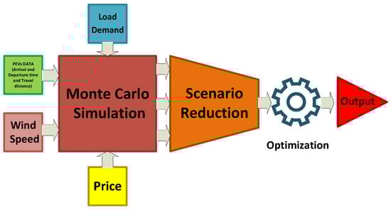 22]. Monte-Carlo is applied to produce different scenarios based on the input variables such as arrival and departure time, initial SOCs derived from travel distance, and the type of vehicle in order to get battery characteristics. The initial SOC of each PEVs is derived from Equation (18).